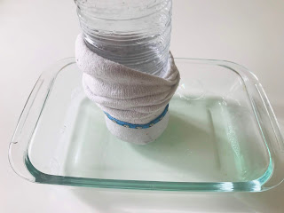 Cogemos la botella y la metemos en el recipiente mojando el calcetín. Escurrimos un poco.